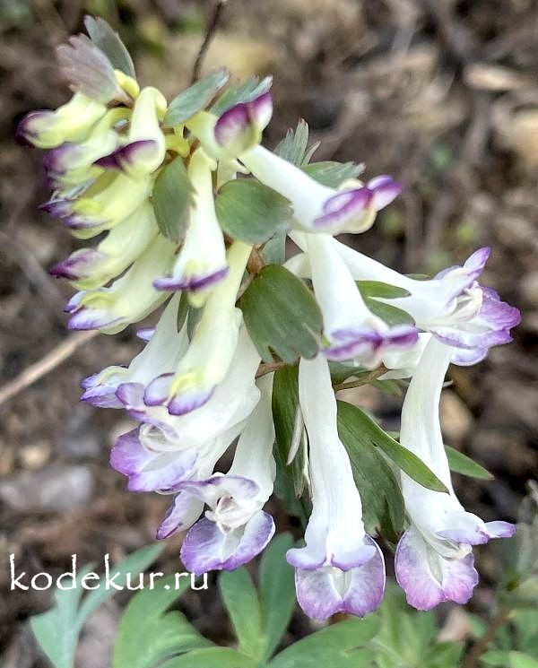 Высота 15-30 см. Цветки трубчатые с длинным шпорцем, белые с бледно-фиолетовой каймой. Цветёт в апреле-мае. Клубневая. Эфемероид.
