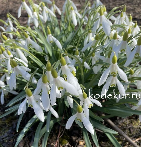 Цветки белые, поникающие. Внутренние лепестки с зелёным пятном. Диаметр цветков до 3 см. Листья тёмно-зелёные. Цветение обильное и продолжительное в апреле. При оптимальных условиях может цвести около 30 дней. Ароматный. |