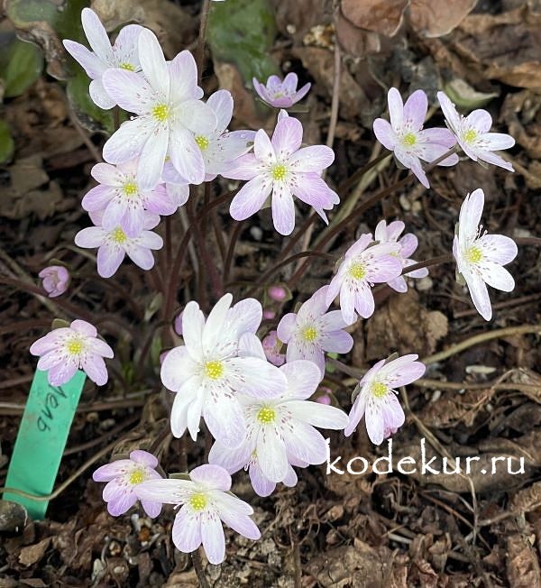 Константинова Н.Ю. Низкорослое растение высотой 10-15 см. Листья прикорневые на длинных черешках, триждылопастные, кожистые, зимующие.Цветки белые с широким сиренево-розовым окаймлением по краю лепестков, тычинки розовые, бутоны розовые. Цветёт одновременно с развертыванием листьев, рано весной в течение 20 дней. |