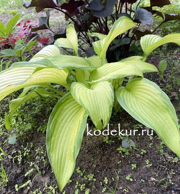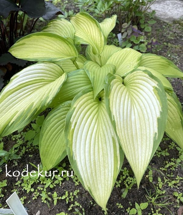 Хоста группы XL. D. Van Eechaute. Спорт от сорта Behemoth. Один из самых красивых редких сортов! Очень большая хоста, высотой 80-90 см во взрослом возрасте. Уникальная расцветка: листья жёлтые с зелёной каймой и заметным жилкованием. В течение сезона листья зеленеют, но контраст с каймой сохраняется. Длинные крупные изогнутые листья на высоких черешках. Нарастает медленно. |