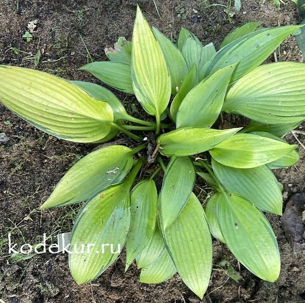 Хоста группы М. Jan van den Top/Danny Van Eechaute, 2004 г. Спорт хосты "Джун". Листья яркие, блестящие, жёлтые с зелёным нешироким краем, с течением времени куст несколько меняет свою яркую окраску на менее яркую. При посадке на солнце сорт сохраняет свою яркость почти все лето. При посадке в тени желтый цвет достаточно быстро переходит в шартрез, а узкие зеленые края становятся сине-зелёными. Отличается от "Джун" блеском, отсутствием густого слоя воскового налёта. |