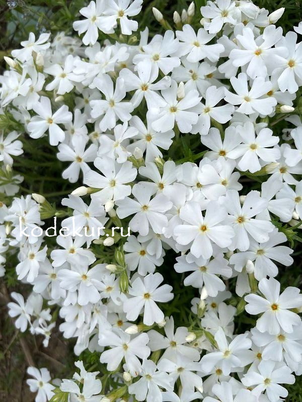 Один из самых красивых и распространённых белых сортов. Цветки белоснежные, красивой колесовидной формы диаметром 1,5 см. Образует вечнозёленые плотные коврики. Лежачие стебли сплошь покрыты тесно сидящими мелкими, узкими, острыми и жесткими листьями. |