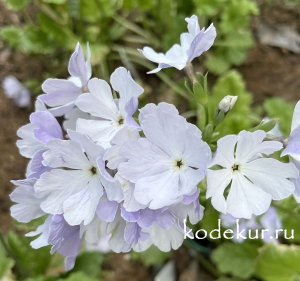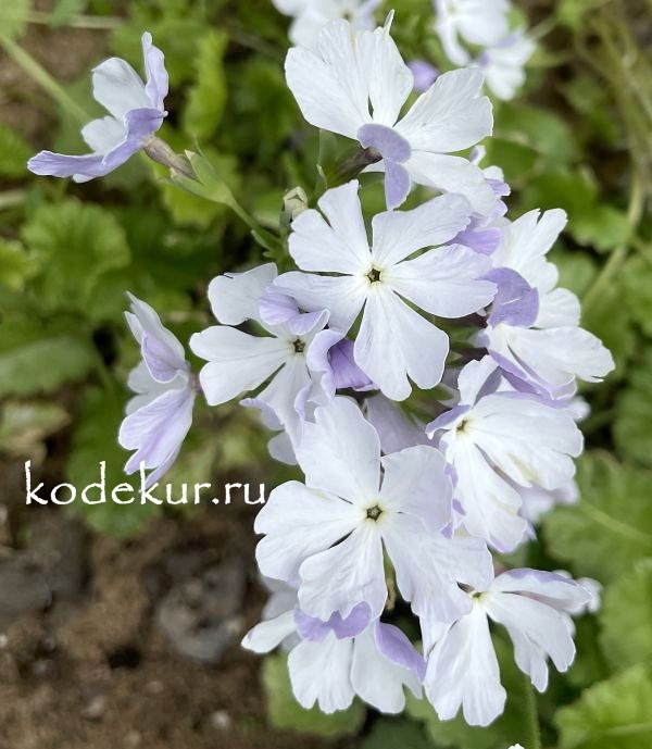 Собственный сеянец. Листья на длинных черешках, продолговато-овальные, крупнозубчатые, опушённые. Цветоносы высотой до 30 см. Цветки белые с голубоватой подкладкой. Цветки диаметром до 3 см, собраны в рыхлые зонтиковидные, очень декоративные соцветия по 6-15 шт. Цветёт в июне в течение 20-25 дней. |