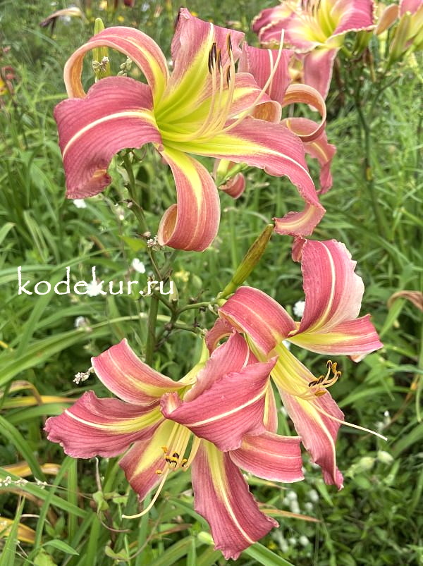 Michaels, 2008 г. (sdlg × Wildest Dreams) Spider 4,17:1. Dip, Sev, ML, Diurnal, 74/17. Фуксиевый с большим розовым глазом и кремовыми продольными жилками на лепестках, горло зелёное. Образует 18 бутонов, 2 ветви. |