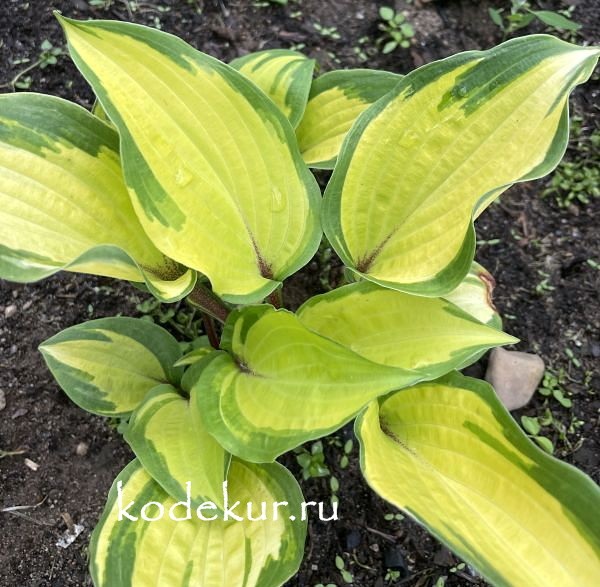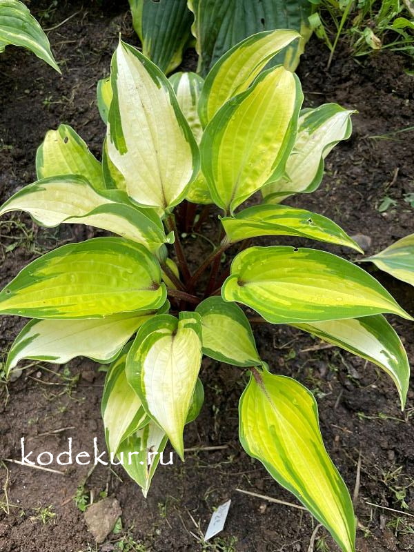 Хоста группы M. Walters Gardens Inc. Спорт хосты Paradise Island. Жёлтые листья с широкой зелёной каймой, бордовые черешки. Цветы лавандовые. |