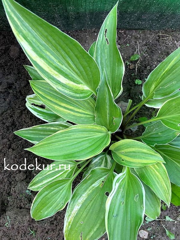 Хоста группы M. Danny Van Eechaute. "Exotic Dancer" x (x "Red Neck Heaven"). Streaked (страйк). Очень эффектный сорт! Редкая новинка! Листья удлинённые, с оттянутым острым кончиком, очень плотные, голубовато-зелёные с неравномерной штриховкой от светло-жёлтой до кремовой и почти белой. Окраска неустойчива и может меняться. Цветки - светло-лавандовые. |