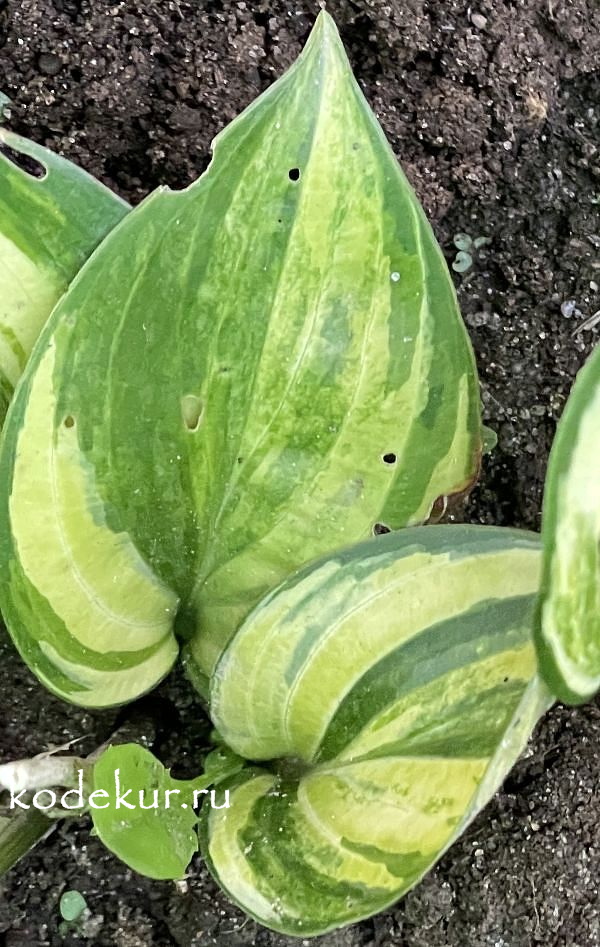 Хоста группы M. I. Chrystal/M. & J. Fransen. "Dorothy Benedict" х "Shining Tot" . Streaked (страйк). «Выглядит хорошо». Листья сердцевидные зелёные с жёлтыми полосами. Цветки лавандовые. |