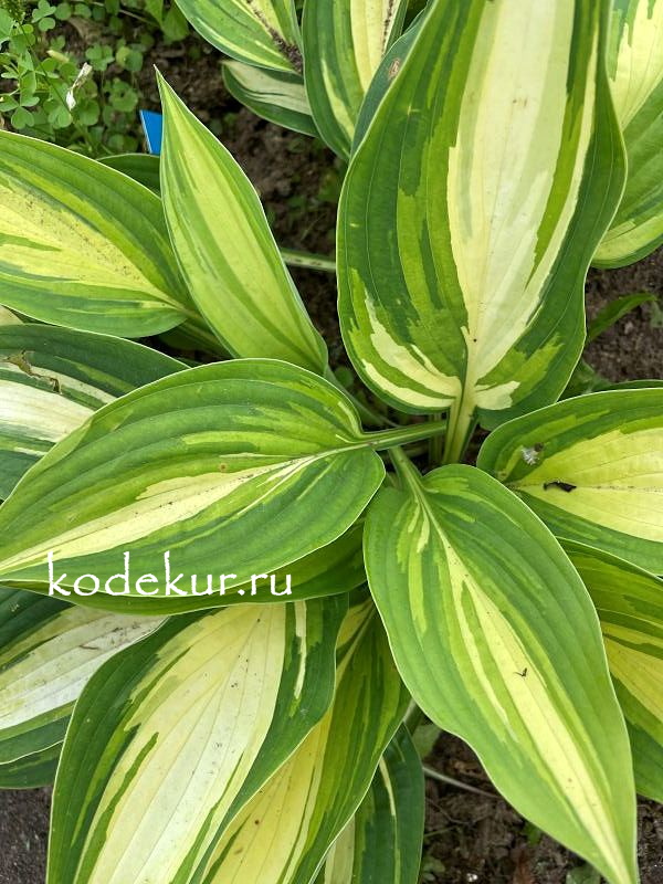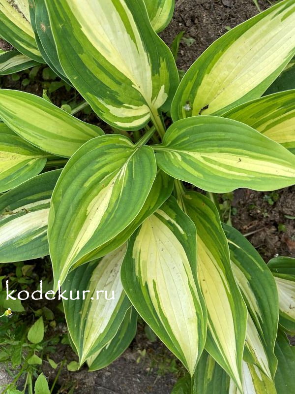 Хоста группы L. M. Chastain/R. Goodwin, 2005 г. Нарядная породистая хоста с жёлто-кремовым центром и каймой в нескольких оттенках зелёного. Во взрослом возрасте листья становятся более жатые, штрихованность придает индивидуальную раскраску каждому листу. Цветки лавандовые. |