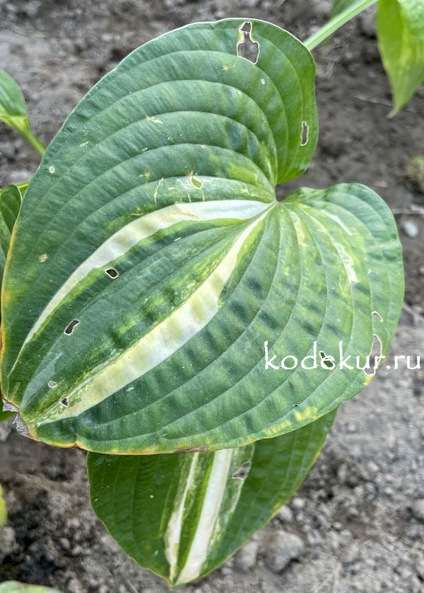 Хоста группы M. P. Aden. От опыления сортов Tokudama Aureonebulosa и Tokudama Flavocircinalis. Зелёная с белым перьевидным центром. Цветки светло-лавандовые. |
