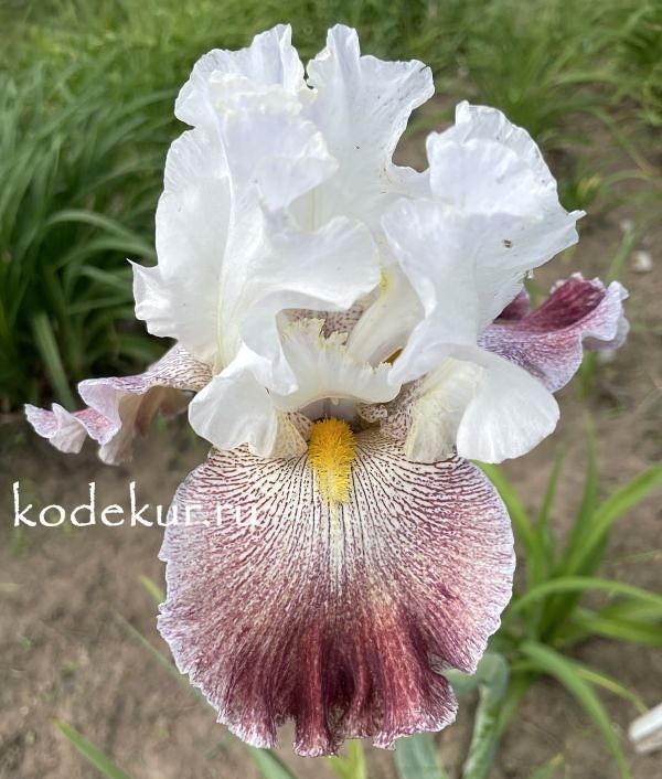 Black, 2007 г. Уникальная окраска. Снежно-белые стандарты и на таком же поле фолов густо расположенные розово-фиолетовые и сливовые прожилки и точки.Бородка жёлтая. Гофрированный и слегка кружевной. Среднераннего срока цветения. |